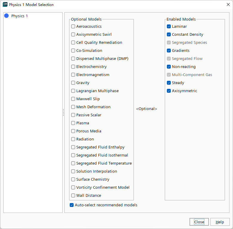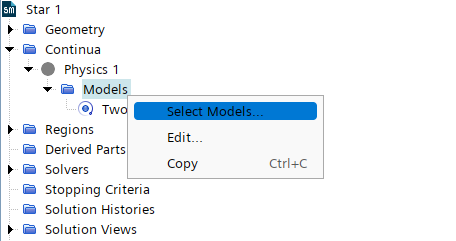 右键选择模型树节点Continua → Physics 1,点击弹出菜单项Select models…,弹出设置对话框