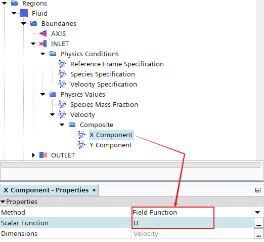 选中节点 X Component,指定Method为Field Function ,设置Scalar Function为U
