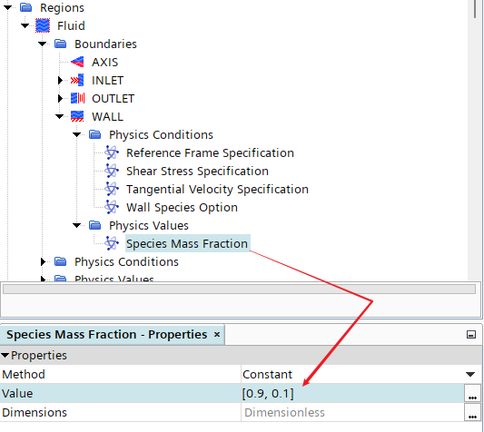 选中节点 Species Mass Fraction,指定Value为**[0.9, 0.1]** ,如下图所示