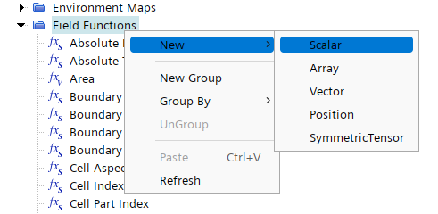 右键选择模型树节点Tools > Filed Functions,点击弹出菜单项New → Scalar创建标量表达式,命名为U