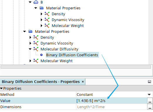 选中节点Molecular Diffusivity → Binary Diffusion Coefficients ,指定 Value为1.43E-5 m2/s ,如下图所示