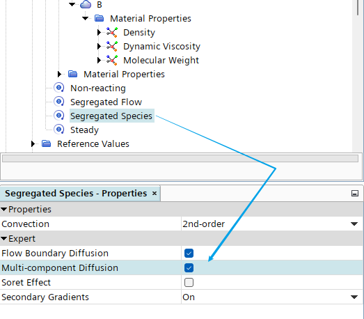 选中模型树节点Segregated Species ,激活选项Multi-component Diffusion ,如下图所示