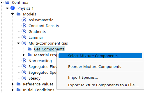 鼠标右键选择模型树节点 Gas Components,点击弹出菜单项Select Mixture Components… 打开设置对话框