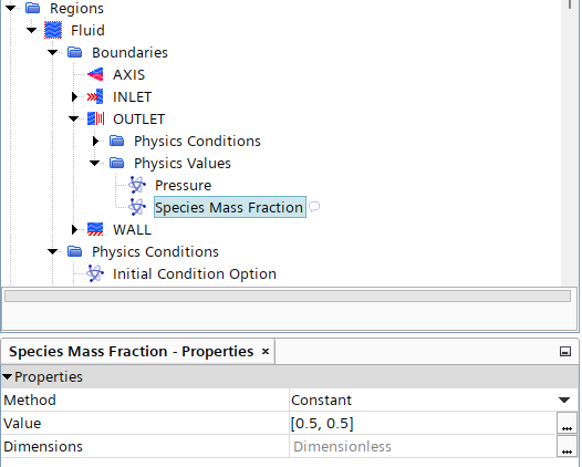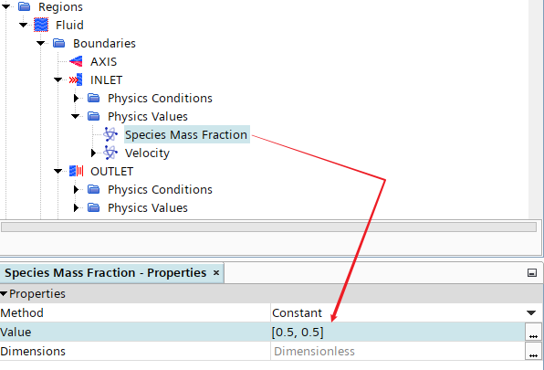 选中节点 Species Mass Fraction,指定Value为**[0.5,0.5]** ,如下图所示