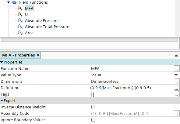 定义无量纲变量MFA,如下图所示定义其值为 (0.9-${MassFractionA})/(0.9-0.5)