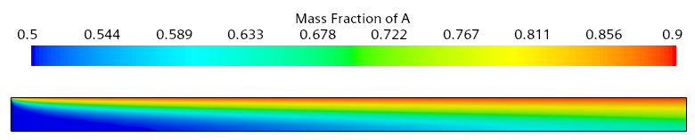 inlet边界入口为充分发展层流速度边界,平均速度为1 m/s,其中inlet入口中组分A、B的质量分数均为0.5,Wall入口边界组分A与B的质量分数分别为0.9与0.1。
