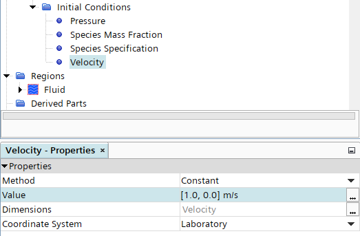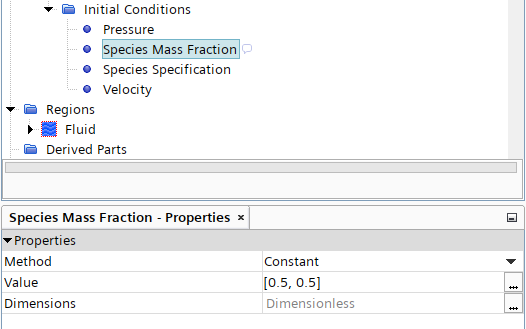选中模型树节点Initial Conditions → Species Mass Fraction ,设置初始组分为**[0.5,0.5]** ,如下图所示