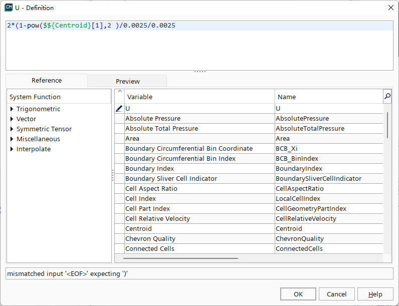 属性窗口中点击Definition右侧按钮,弹出变量定义对话框,如图所示,变量定义对话框中指定速度表达式为 2*(1-pow($${Centroid}[1],2)/0.0025/0.0025),如下图所示