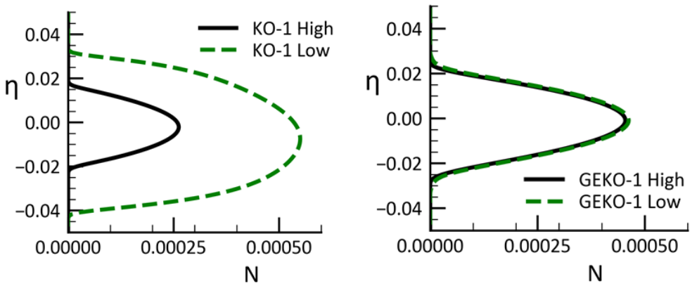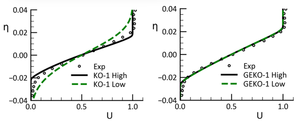 包含CD的第二个效果是可取的,因为其避免了基于标准方程(不包含CD项)的模型对自由流值的强烈敏感性。正如文献[52]中详细讨论的那样,标准模型在边界或自由剪切层(自由流)外的 水平发生变化时,计算结果会有很大差异。图 98 以混合层为例说明了这一点。图的左边部分显示了 Wilcox k- 模型对自由来流 变化在速度分布上的反应,右边部分显示了使用 GEKO k- 模型(包括 CD 项)进行的相同测试。图 99 显示了涡流粘度分布上的相同影响,在标准 k- 模型中,低自由流值和高自由流值之间的差异超过 2 倍。由于自由流值的高低不易控制,而且通常是基于粗略估算的入口值,因此与这些值无关的解对于可靠的模拟至关重要。