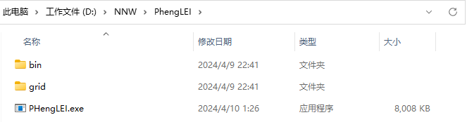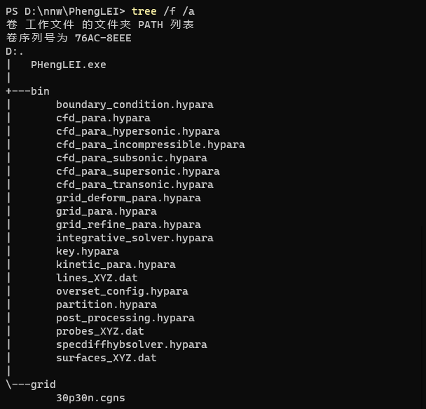 其中bin文件夹中放置计算参数配置文件,grid文件夹中放置网格相关文件。进行计算后还会产生一个名为result的文件夹,其中放置结果数据文件。可执行文件PHengLEI.exe放在这些文件夹的外部。