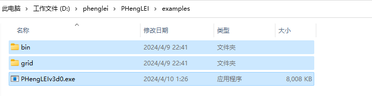 将PHengLEI项目路径下的examples文件夹中的 bin及grid文件夹以及编译完成的PHengLEI可执行文件拷贝到工程文件夹