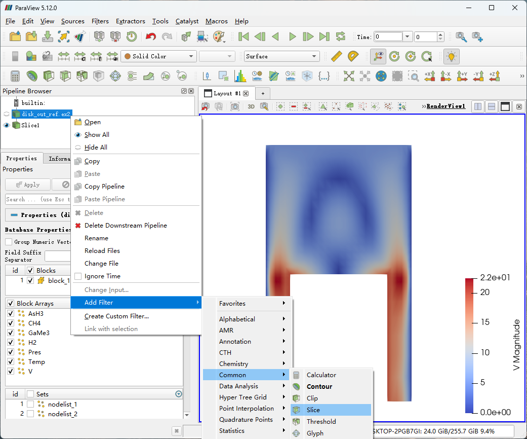 右键选择管道浏览器中的节点 disk_out_ref.ex2 ,点击弹出菜单项 Add Filter → Common → Slice ,如下图所示
