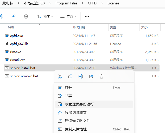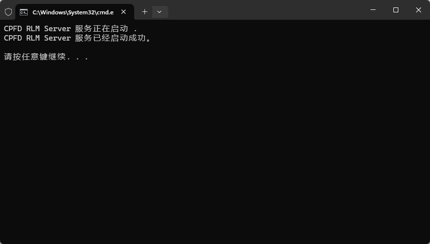 以管理员身份运行(右键点击)C:\Program Files\CPFD\License\server_install.bat,并等待新的服务“CPFD RLM Server”被安装并启动。