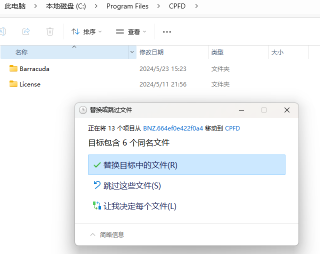 将“CPFD”文件夹从破解文件中复制到原始文件夹上(默认在 C:\Program Files\CPFD),并覆盖。