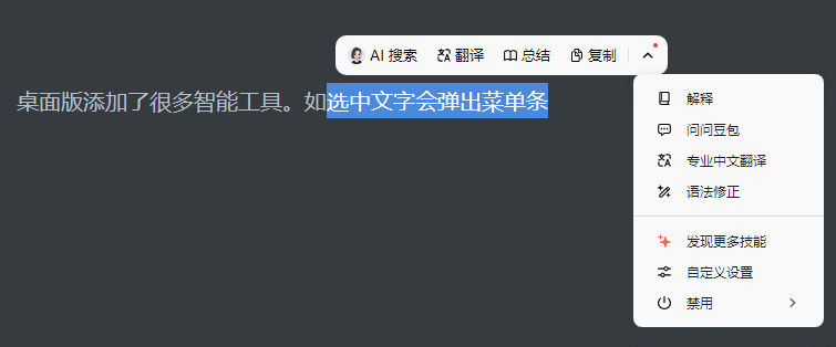 桌面版添加了很多智能工具。如选中文字会弹出菜单条,选择菜单直接可以唤醒豆包进行操作,还是比较方便的。