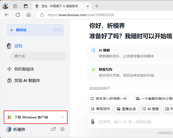 进入豆包的官方首页,在其左下方即可发现有下载Windows客户端的链接,点击即可下载安装。