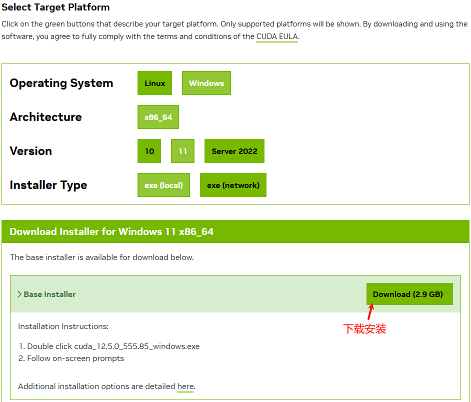 进入下载网址:https://developer.nvidia.com/cuda-downloads 。当前最新版本为12.5。若安装12.5版本的话,可以点下图中1所示的操作系统选择按钮。若需要安装老版本,可以点下图中2所示的链接。