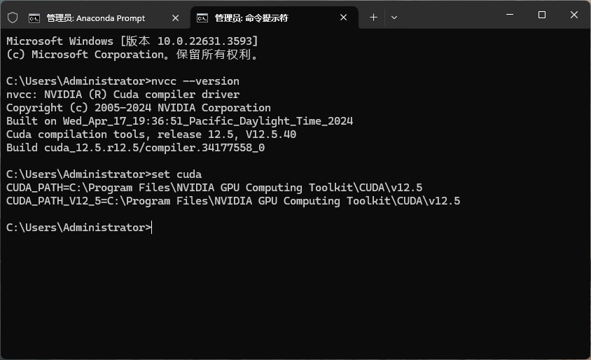 安装完毕后在命令行窗口输入nvcc --version或set cuda,若如下图所示显示,则表示CUDA安装成功。