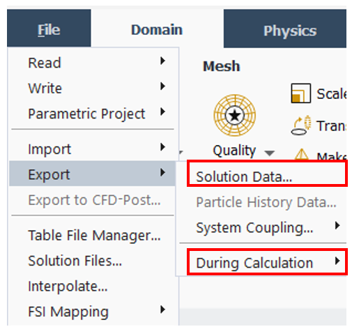 在 Fluent 的“File”下拉菜单中,设置输出 CFD-Post 专用文件相关选项。其中,“during calculation”仅适用于瞬态分析。