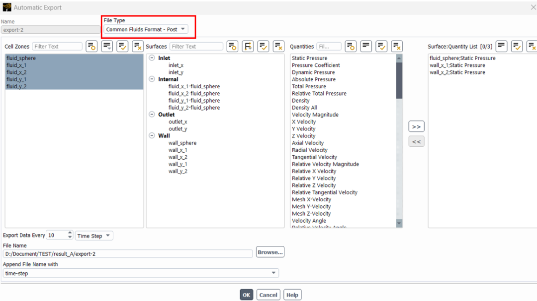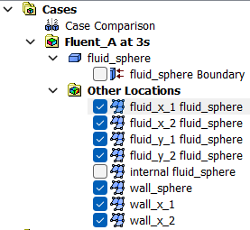 CFF Post文件可仅保存特定区域的部分物理量数据。如上图所示,CFF Post文件中仅保存流体域“fluid_sphere”和固体表面“wall_x_1”、“wall_x_2”的压力值。