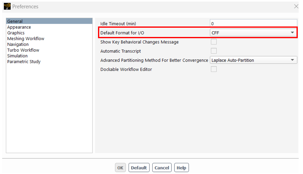 在 Fluent 设置中,默认输入输出格式设置为“CFF”,则结果保存为 .dat.h5 格式;默认输入输出格式设置为“Legacy”,则结果保存为 .dat 格式。