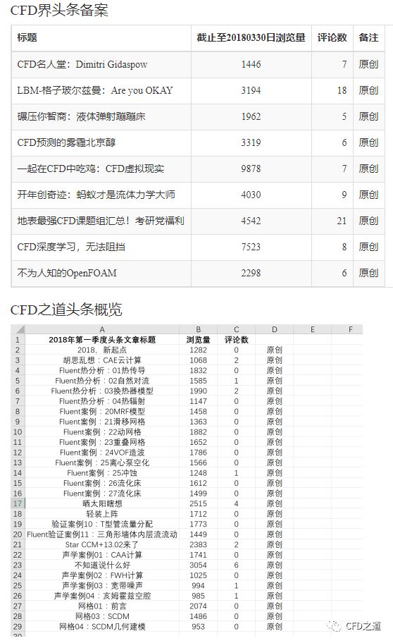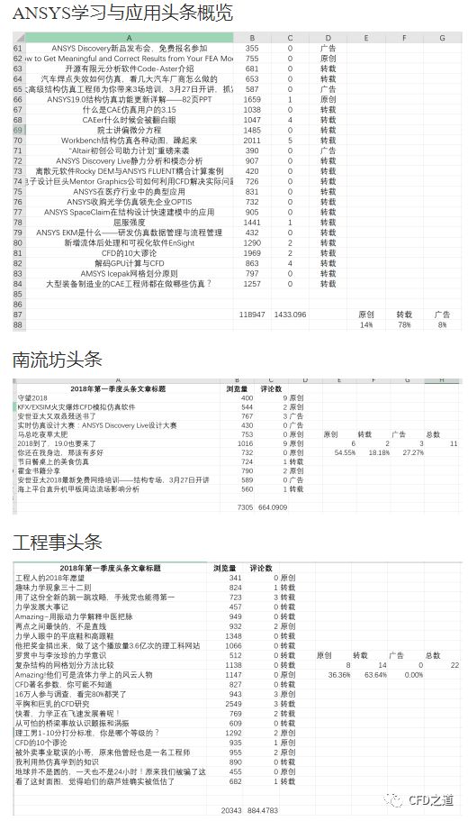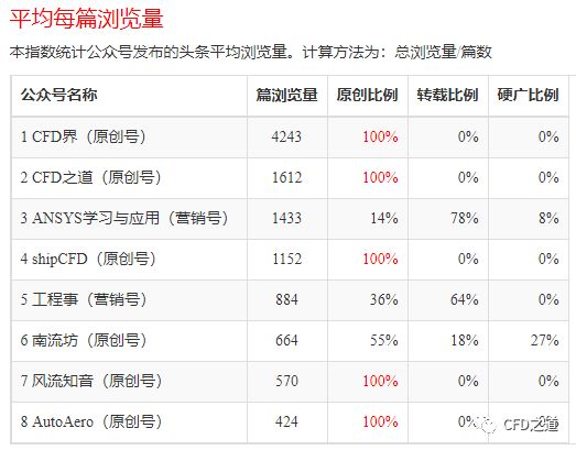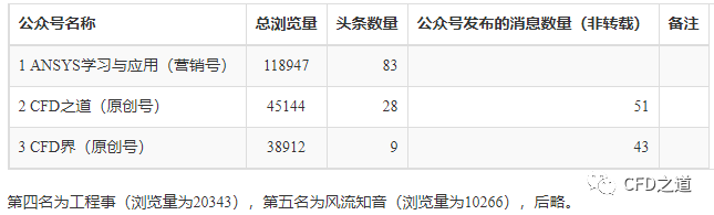 今天看到CFD界推送的一篇名为《公众号影响力分析》的文章,统计了2018年第一季度CFD/CAE类自媒体影响力,该文网络连接:【http://www.cfd-china.com/topic/1460/公众号影响力分析】,文中分析列举了目前做CFD的一些公众号数据,很荣幸本公众号表现还不错。这里不是很清楚作者是怎么获取到数据的,这里姑且认为数据来源可靠,我只是比较了本公众号的数据,其他公众号的数据没有时间去关注。鉴于此文仅有数据没有分析,本文就这些数据做一些简单的分析。