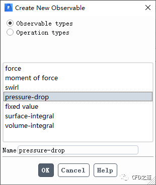 如图所示,对话框中选择选项Observable types,选择列表项pressure-drop,点击OK按钮打开新的对话框