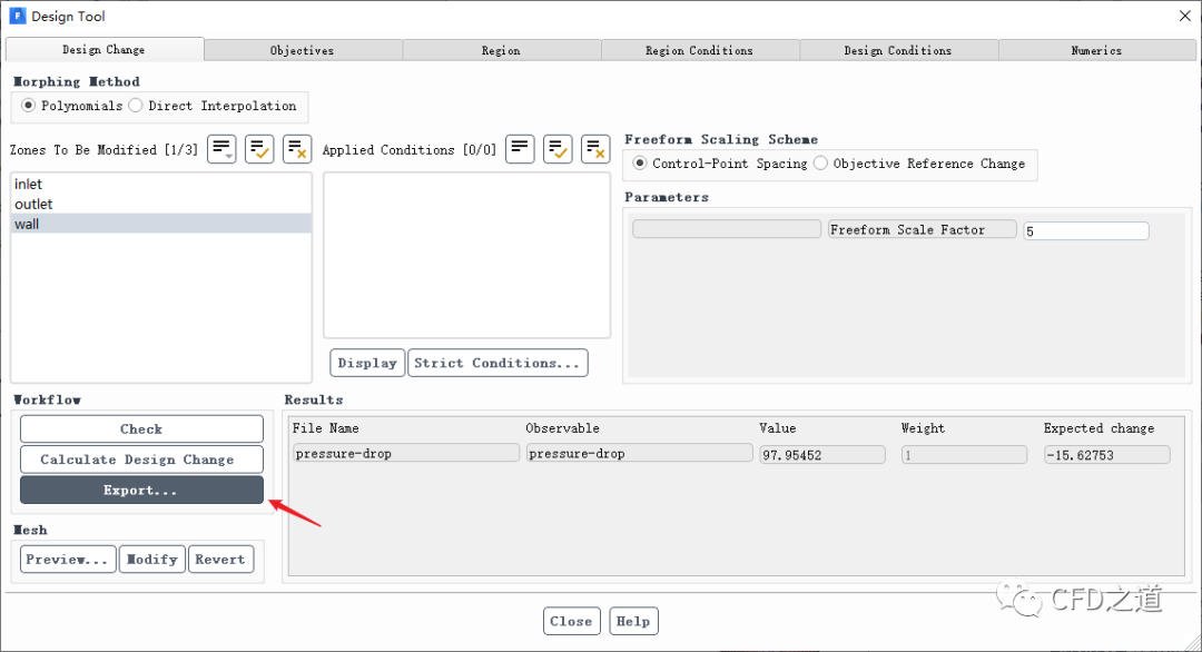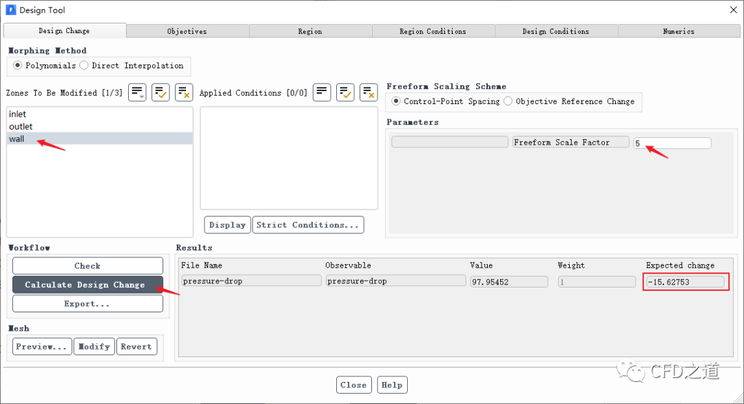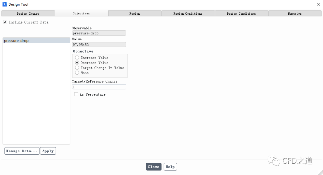 进入Objectives标签页,如下图所示,选择列表项pressure-drop,选择选项Decrease Value,点击按钮Apply