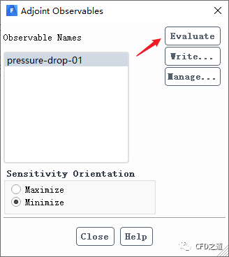 可在Adjoint Observables对话框中点击Evaluate按钮查看压降值