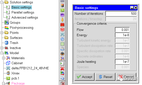如下图所示,双击模型树按钮Basic parameters,弹出对话框中设置辐射模型为Off