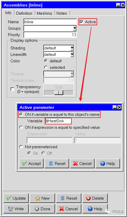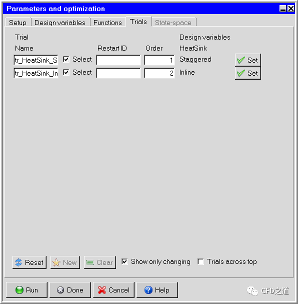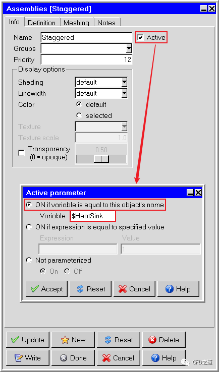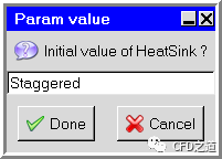 相同方式双击模型树节点Staggered,弹出设置对话框,设置变量为$HeatSink,点击Done按钮关闭对话框