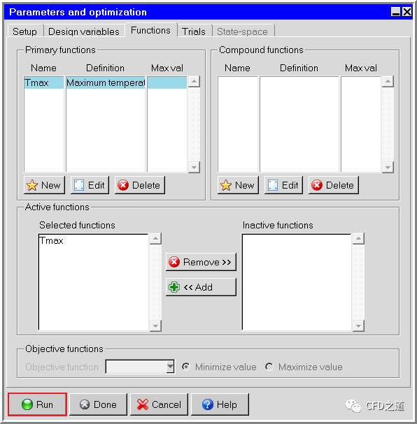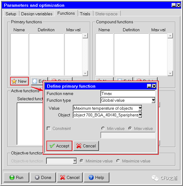 进入Functions标签页,如下图所示定义新变量Tmax为芯片最大温度,点击Accept关闭对话框 -