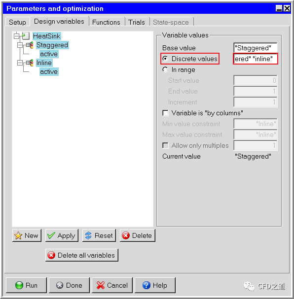 点击菜单Solve → Run optimization弹出设置对话框,如下图所示,进入Design variables标签页,设置Discrete Values为“Staggered” “inline”