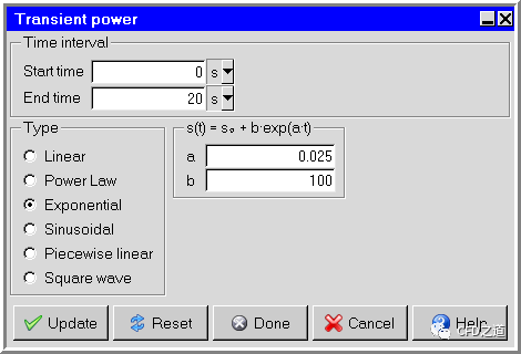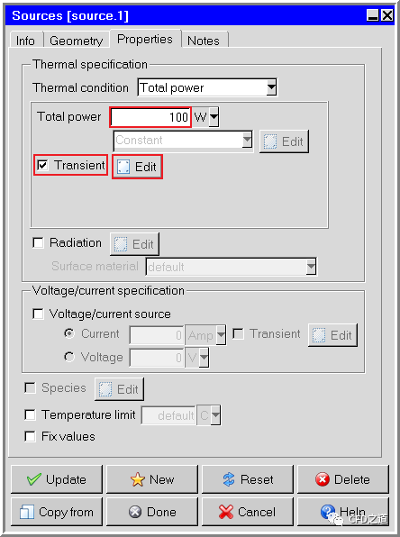 进入Properties标签页,指定Total power为100 W,激活选项Transient,点击Edit按钮弹出设置对话框
