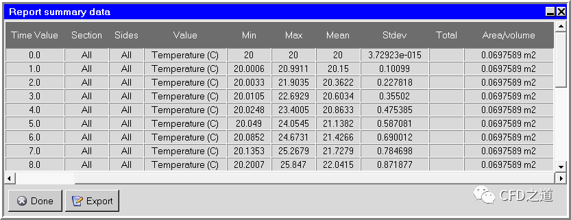 点击菜单项Solve → Define report弹出对话框,可统计各对象各时刻的温度信息