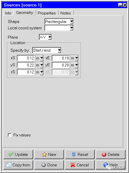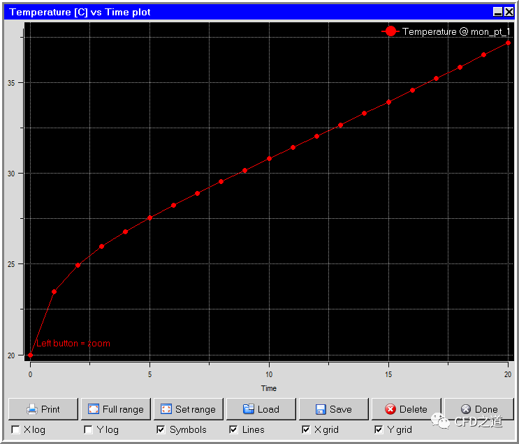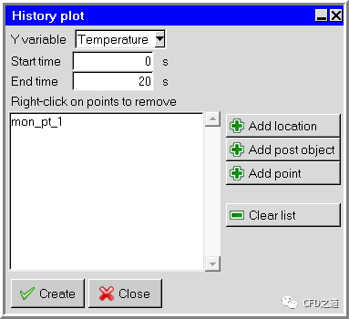点击菜单项Post → History plot打开设置对话框,如下图所示可显示某位置温度随时间变化规律