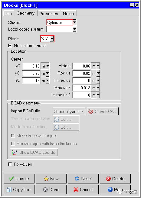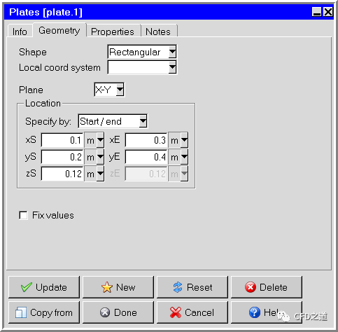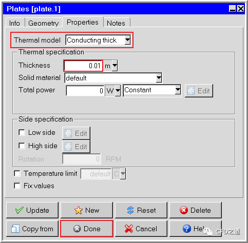 进入Properties标签页,设置Thermal model为Conducting thick,指定Thickness为0.01 m