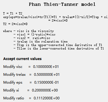 本案例演示高Weissenberg数下粘弹性流体流动计算。流体介质粘度采用Phan Thien-Tanner粘弹性模型,其参数为: