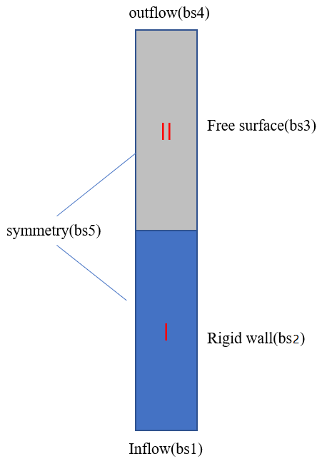 计算模型及边界条件如下图所示。计算区域宽1 cm,计算域I与计算域II长度均为4 cm,入口为体积流量边界,流量Q=1 cm3/s