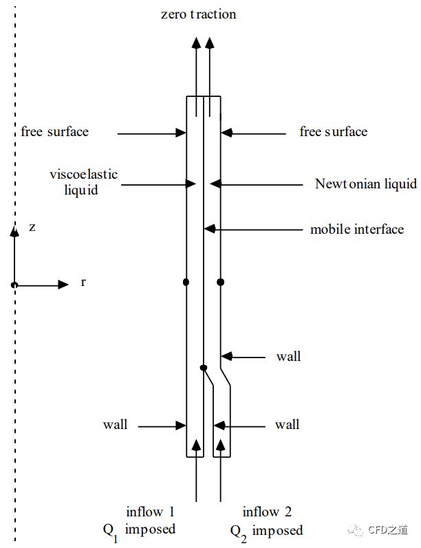 案例的流动几何及边界条件如图所示。粘弹性流体与牛顿流体从不同的入口进入计算区域,计算自由面及交界面。