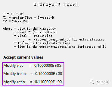 对于粘弹性液体,选择Oldroyd-B本构模型。流体材料参数为:
