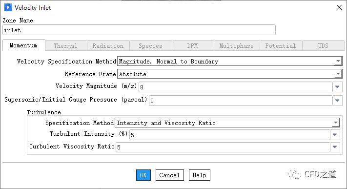 设置入射inlet的计算参数,如下图所示