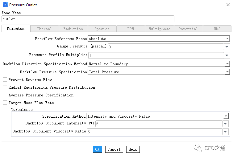 设置出口为压力出口,采用默认边界条件