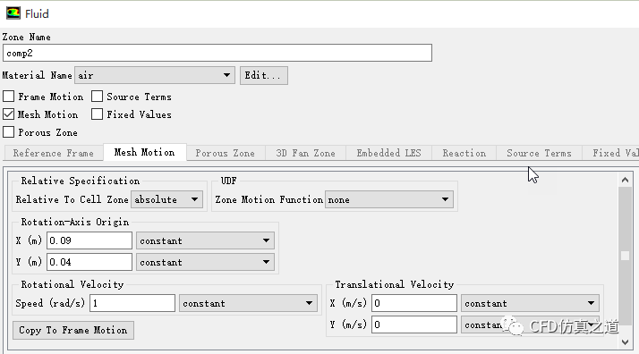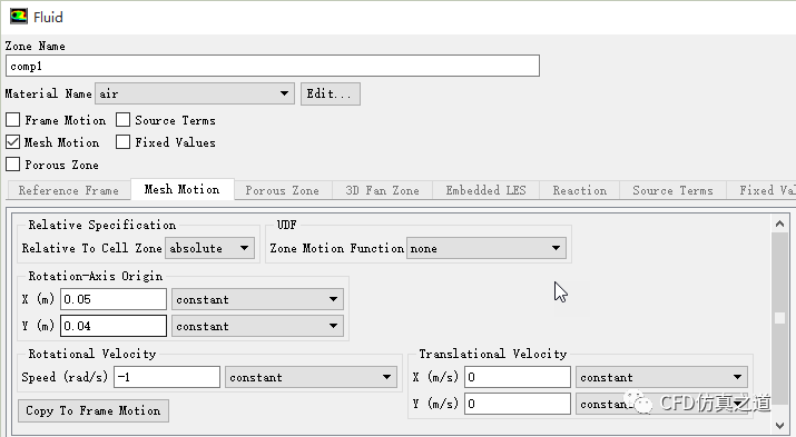 对于comp1区域,指定其旋转中心坐标为(0.05,0.04),旋转角速度-1 rad/s。如下图所示。