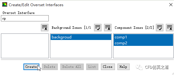 在弹出的对话框中设置overset Interface名称为cp,选择Background Zones为前面命名的background,选择Component Zones下的comp1及comp2(前面命名的两个前景区域)。