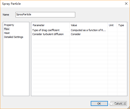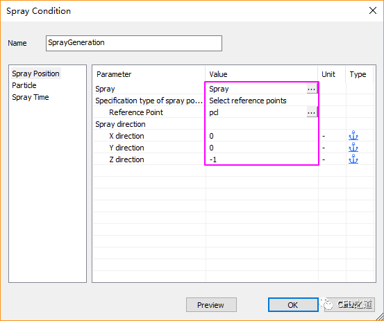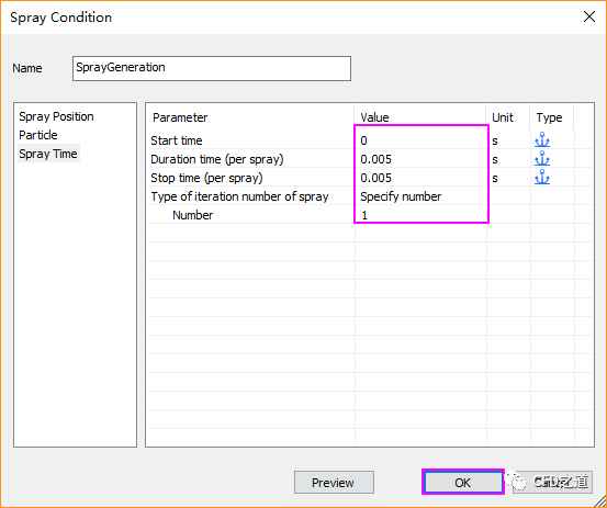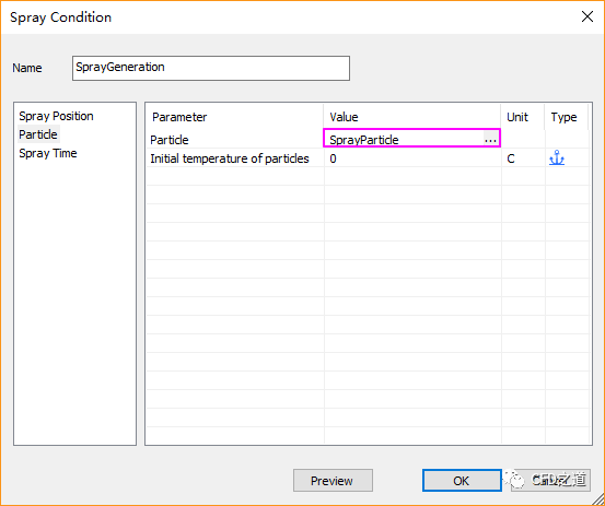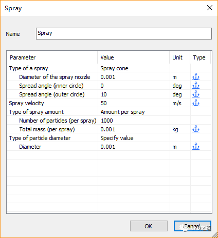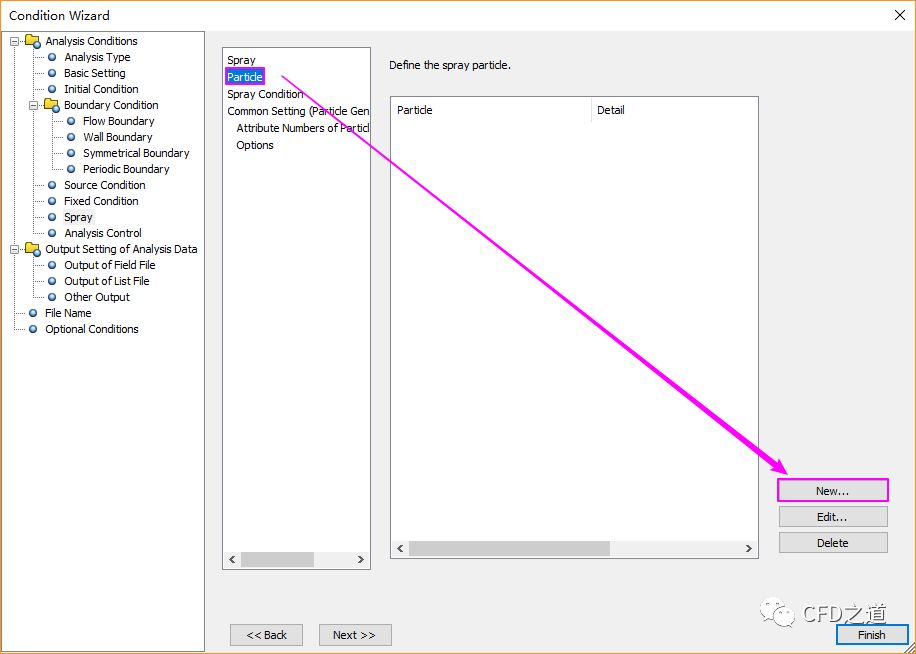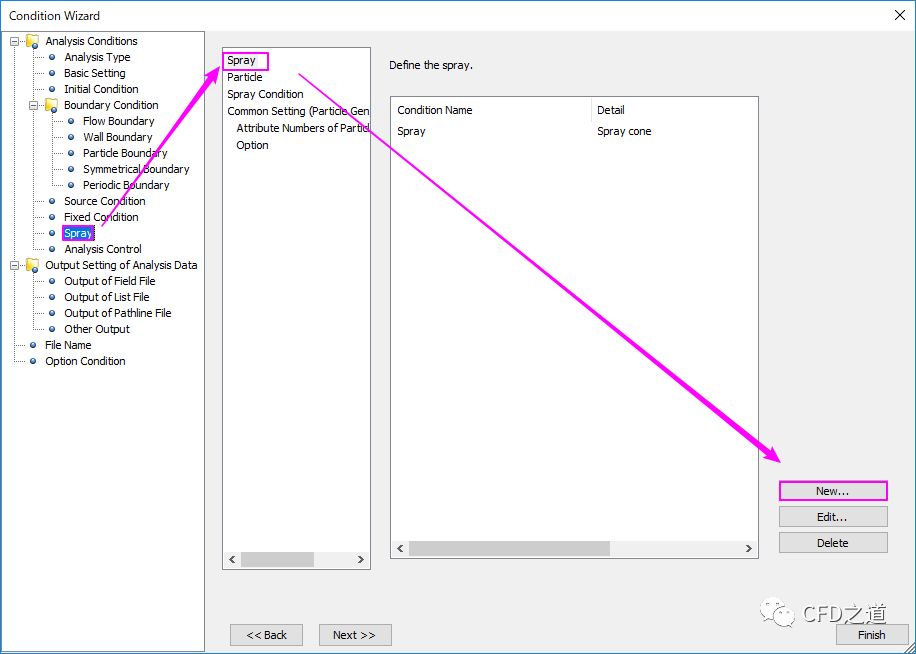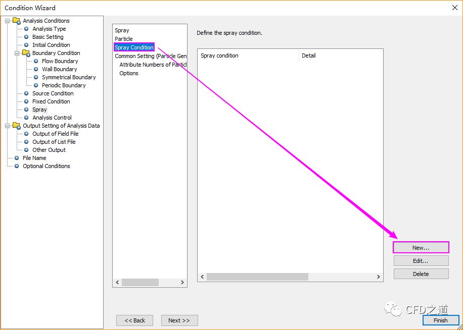 选中选项Spray Conditions,点击按钮New…弹出对话框,设置喷雾条件