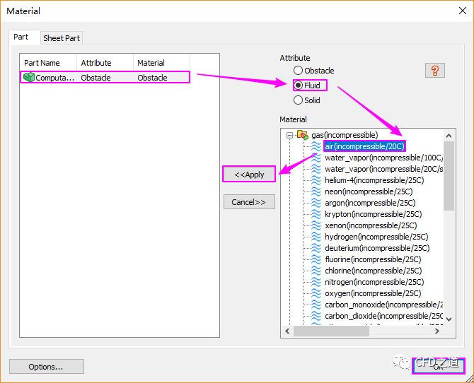 如下图所示操作,设置计算区域材料为不可压缩空气
