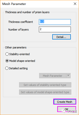 点击模型树节点Mesh Parameter,弹出对话框中采用默认设置,点击按钮Create Mesh创建网格参数,点击OK按钮关闭对话框