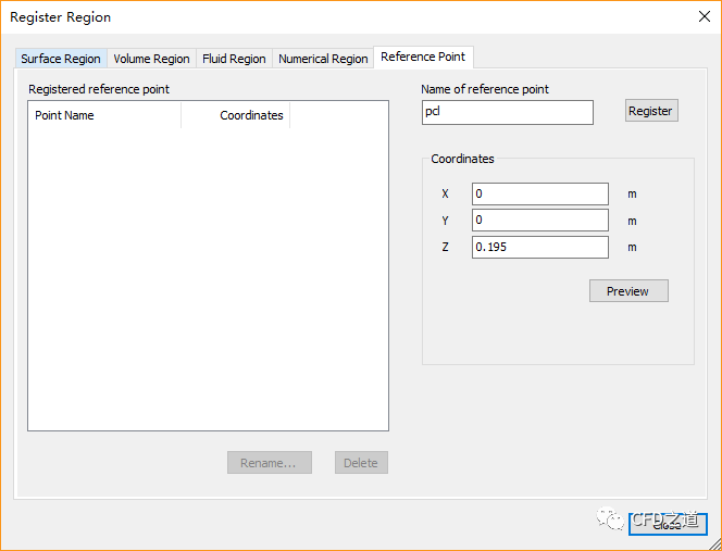 点击模型树节点Register Region打开对话框,创建参考点pcl,指定其坐标为(0 0 0.195)
