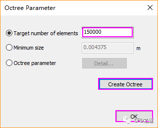 点击模型树节点Octree Parameter,弹出对话框中采用默认设置,点击按钮Create Octree创建网格参数,点击OK按钮关闭对话框